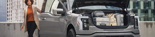 - Versatile Cargo Solutions: The F-150 Lightning® features a 5.5-foot Styleside pickup box along with a 14.1 cubic feet front trunk, offering secure, easily accessible storage space that’s unaffected by the weather. The clever design of the front trunk, or "frunk," utilizes the space typically occupied by an engine in combustion vehicles, providing additional sealed storage for tools, gear, or groceries.
