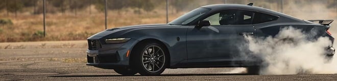 Dark Horse™ Premium: Upgrades that come standard on the highest end 2024 Ford Mustang include aluminum foot pedals, an auto-dimming rearview mirror, electronic-locking center console, premium carpeted floor mats, a leather-wrapped flat-bottom steering wheel with suede insert, heated steering wheel, premium door trim, universal garage door opener, titanium anodized blue gear shift knob, ambient lighting with MyColor®, and optional features like memory driver seat and remote start system.
