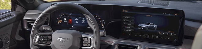 The 2024 Ford Mustang features a sophisticated infotainment system that significantly enhances the car's connectivity and user interface. At the heart of this system is an available 13.2-inch infotainment screen that employs Ford’s advanced Sync 4 software. This large screen is elegantly integrated into the dashboard, extending from the gauge cluster towards the center, all behind a gracefully curved glass panel. This design not only contributes to the car's modern interior aesthetic but also promotes ease of use and accessibility for the driver and passengers.