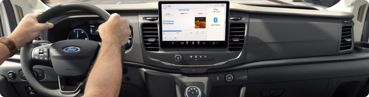 SYNC 4 with the 12-inch center display is now standard across the lineup. The system supports wireless Apple CarPlay and wireless Android Auto, a standard rear-view camera, available 360-degree camera views, enhanced voice recognition, dual USB ports, and Bluetooth connectivity. An available digital rearview mirror is offered on Cargo Van configurations.