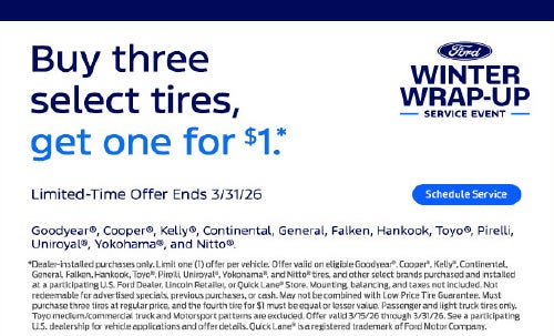 Limited-Time Offer Ends 3/31/26 *Dealer-installed retail purchases only. Limit one (1) offer per vehicle. Offer valid on eligible Goodyear®, Cooper®, Kelly®, Continental, General, Falken, Hankook, Toyo®, Pirelli, Uniroyal®, Yokohama®, and Nitto® tires, and other select brands purchased and installed at a participating U.S. Ford Dealer, Lincoln Retailer, or Quick Lane® Store. Mounting, balancing, and taxes not included. Not redeemable for advertised specials, previous purchases, or cash. May not be combined with Low Price Tire Guarantee. Must purchase three tires at regular price, and the fourth tire for $1 must be equal or lesser value. Passenger and light truck tires only. Toyo medium/commercial truck and Motorsport patterns are excluded. Offer valid 3/15/26 through 3/31/26. See Service Advisor for vehicle applications and offer details. Quick Lane® is a registered trademark of Ford Motor Company.